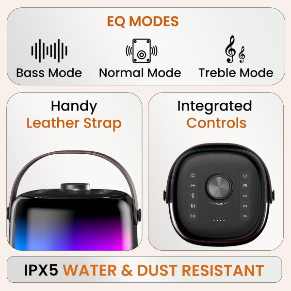 • Compact and Durable Design: The bluetooth speaker with mic, comes in a premium design and is rated IPX5 water-resistant. Accompanied by a sturdy leather handle, it ensures both style and durability for a worry-free and enjoyable experience.